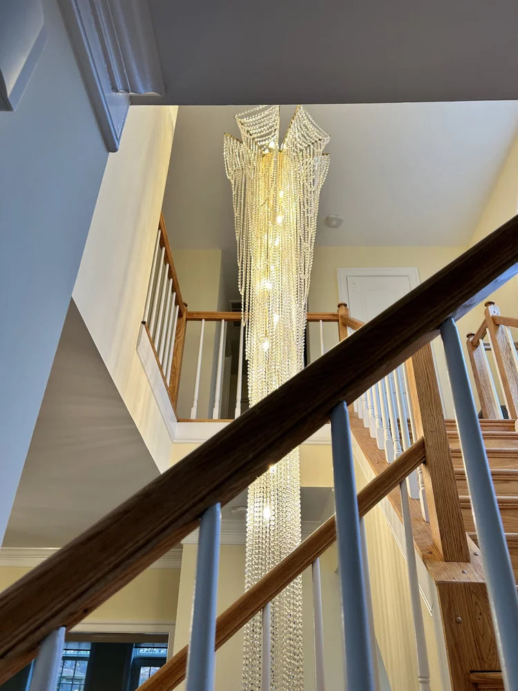 A client from the USA came to us in search of two chandeliers: one for the staircase area and another for the dining area. After closely collaborating with the client, we selected a chandelier from our Waterfall collection for the staircase and a smaller piece from the Valencia collection for the dining table, bringing elegance and charm to both spaces.