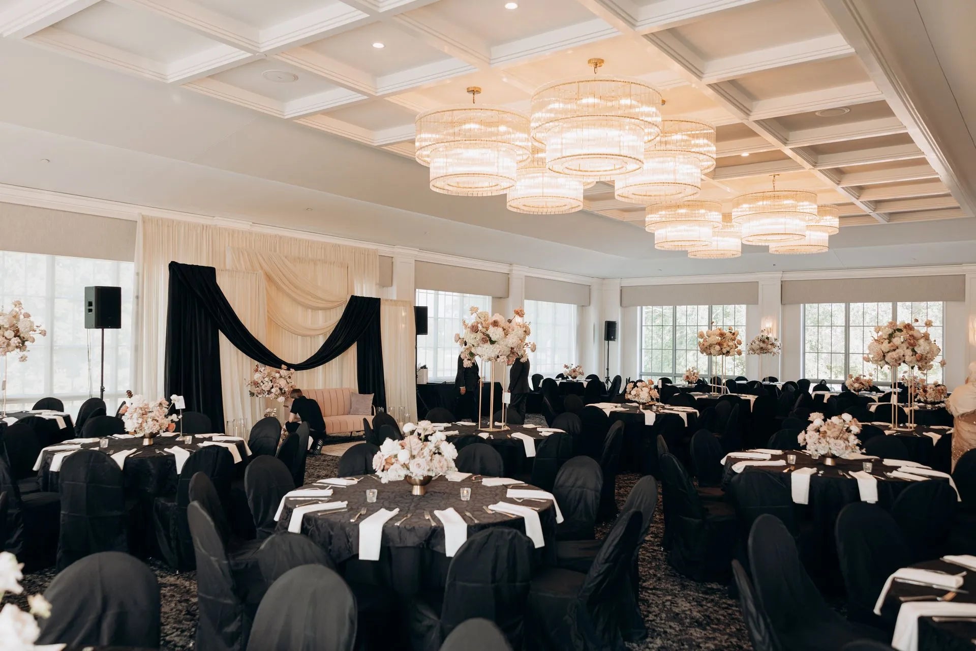 • Statement chandeliers selected to complement the ballroom’s expansive scale and stunning views.