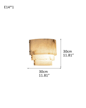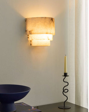 • Hand-carved, three-tier alabaster with natural veining and soft glow.