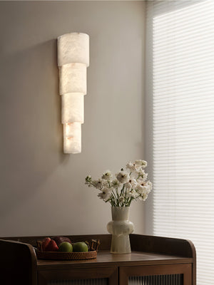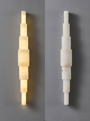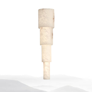 Introducing the Alba Cascade Alabaster Wall Sconce, a sculptural masterpiece designed to elevate your space with its sleek, vertical flow. Crafted from premium alabaster, this light features a cascading effect that beautifully softens the glow, creating an atmosphere of refined warmth and serenity. Each layer is delicately stacked, allowing the alabaster's natural veining and translucency to shine through as the light gently diffuses around the room.
