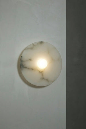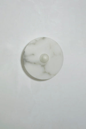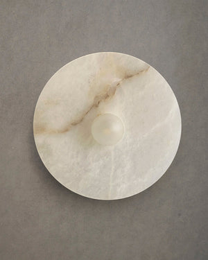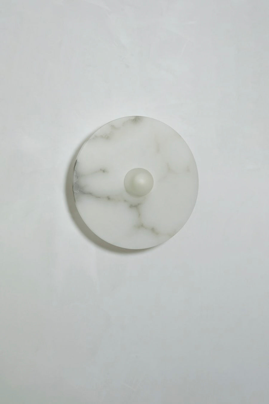 The Alba simple wall light by Spanish designers Contain made of pure alabaster. Measuring 28cm in diameter, the stone disc encircles an opaque optical lens, creating a harmonious halo effect when lit. Part of Contain's 2021 collection, the Alba simple wall light is handcrafted by artisans in Majorca, Spain.