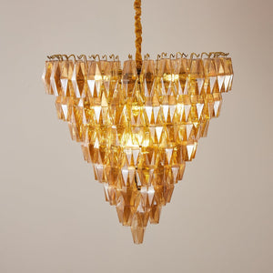 Make a grand statement with the Oasislives Amber Crystal Empire Chandelier, a luxurious centerpiece that captures the elegance of vintage design with a modern twist. Featuring cascading layers of faceted amber glass prisms arranged in a dramatic inverted pyramid shape, this chandelier radiates warm, golden light that transforms any space into a sophisticated setting. Suspended by a gold-finished canopy and fabric-wrapped cord, it’s ideal for high ceilings in entryways, staircases, or formal dining rooms seeking a bold and timeless lighting feature.