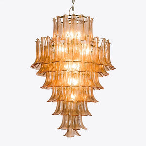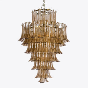 Tiers of curved, amber coloured glass are individually hung onto a satin brass frame to create an outstanding mid-century inspired, petal chandelier.
