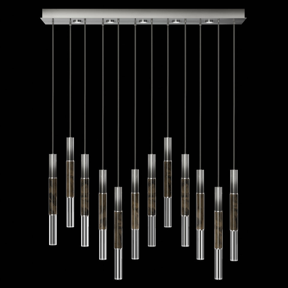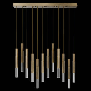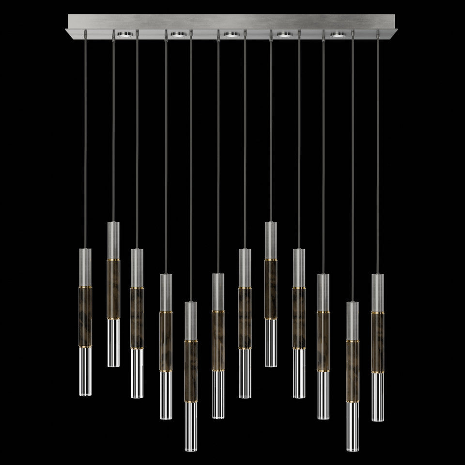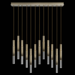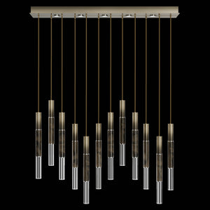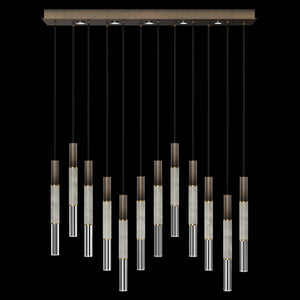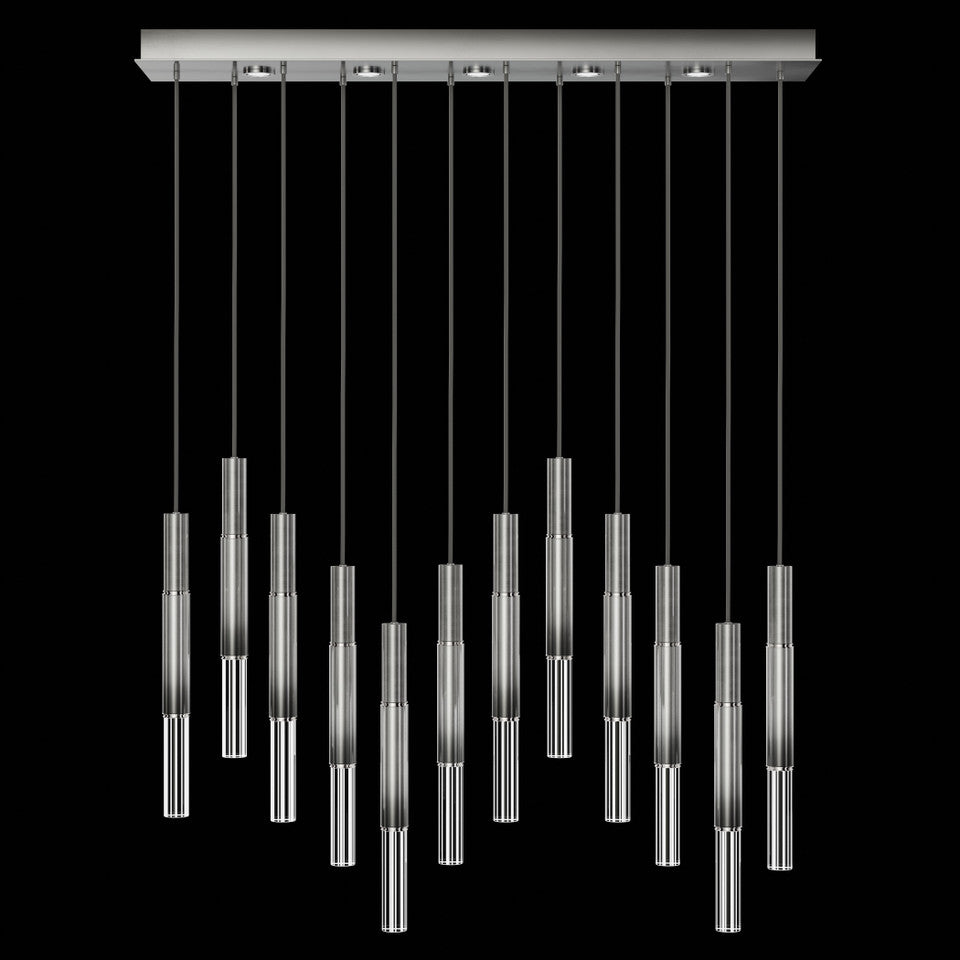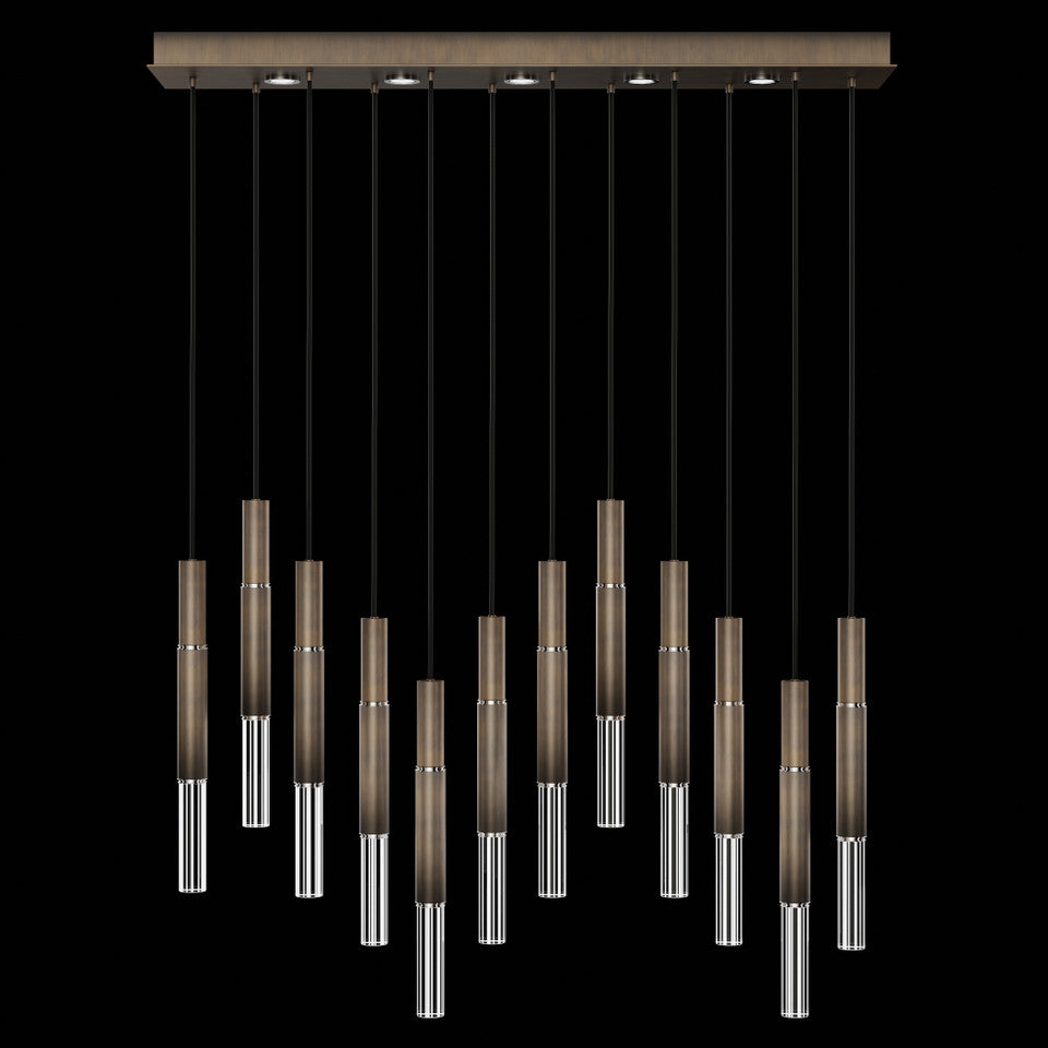 Suspended by adjustable cords, this LED fixture features straight tubular lines and the inclusion of metals carefully handcrafted to transition from parchment to magnificent glass, culminating in a stunning beam of light. Available in a wide range of exquisite finishes, including our five standard finishes and our newest Soft Ombre Bronze & Soft Ombre Silver, with the choice of two inline parchment colors, Charcoal and Smoke, and three special order options: Mink, Burnt Orange & Navy/Gold. Also available with no parchment. Upper & lower lights can be wired independently for single or dual light control.