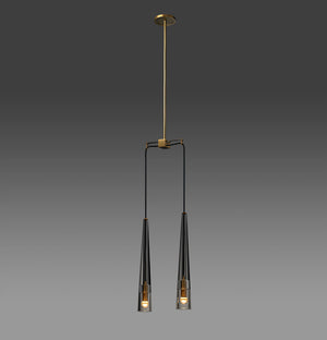 The Apollinaire 2 Light Pendant is machined by hand from solid brass. All parts are hand polished and patina’d. The shades are lead crystal which are turned by hand on a lathe.