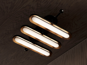 The Circuit series creates rhythm with the repetition of pure shapes. A glowing glass capsule nests in a brass shade, becoming a contained form that multiplies to construct larger fixtures. The Circuit 1 can be ceiling or wall mounted.