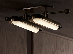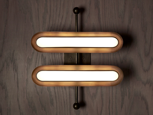 The Circuit series creates rhythm with the repetition of pure shapes. A glowing glass capsule nests in a brass shade, becoming a contained form that multiplies to construct larger fixtures. The Circuit 1 can be ceiling or wall mounted.