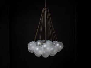 Glass orbs are frosted by hand to create am irregular texture reminiscent of 19th Century frosting techniques. Central light sources emit a soft glow that is refracted through the surrounding cluster of orbs.