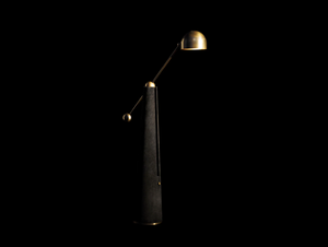 The metronome series evokes the measure and balance of its namesake. A patinated brass sphere perches atop the conical base, which is hand-wrapped in suede to provide a lush tactile contrast. A channel in the firmly grounded base reveals an intimate connection between the two forms. A dimmer knob is set into the base.