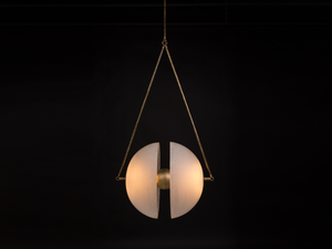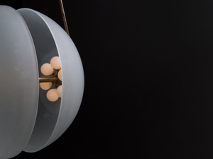 Inspired by the mechanics of neural synapses, this pendant is composed of two hand-molded glass domes that require a 4-art firing process. A brass orb floats in transit between the two hemispheres.