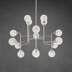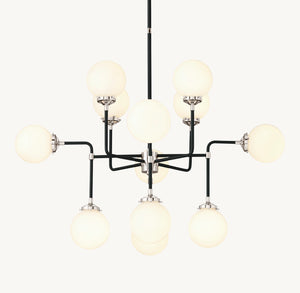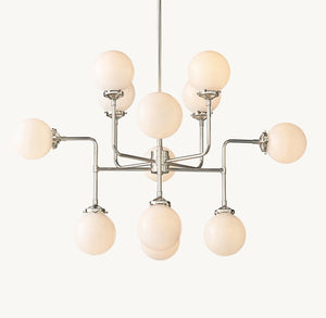 Inspired by 1940s industrialism, our globe chandelier’s lines and spheres are reminiscent of an urban subway map. Eight glass shades are joined by metal tubing and carefully balanced on vertical threaded rods.
