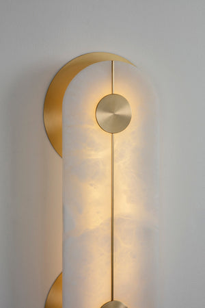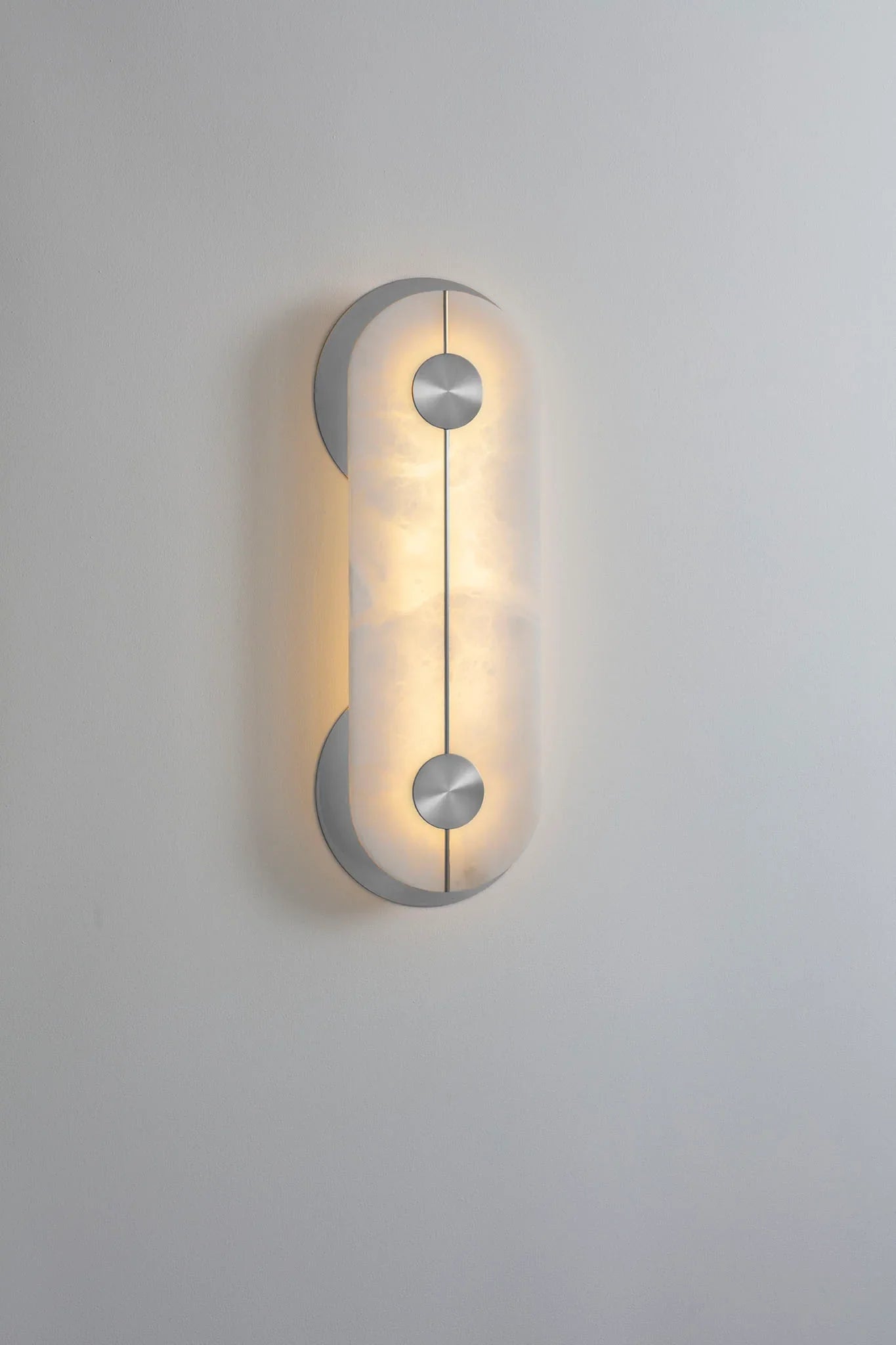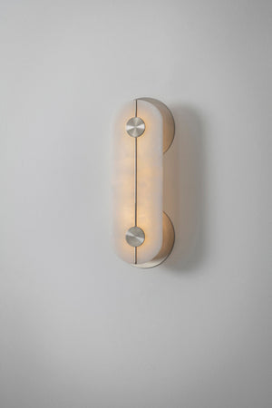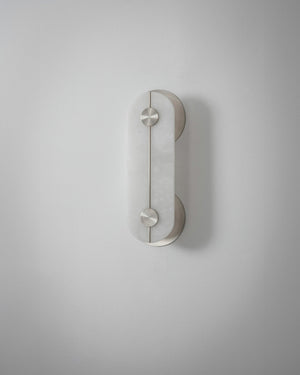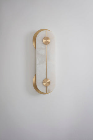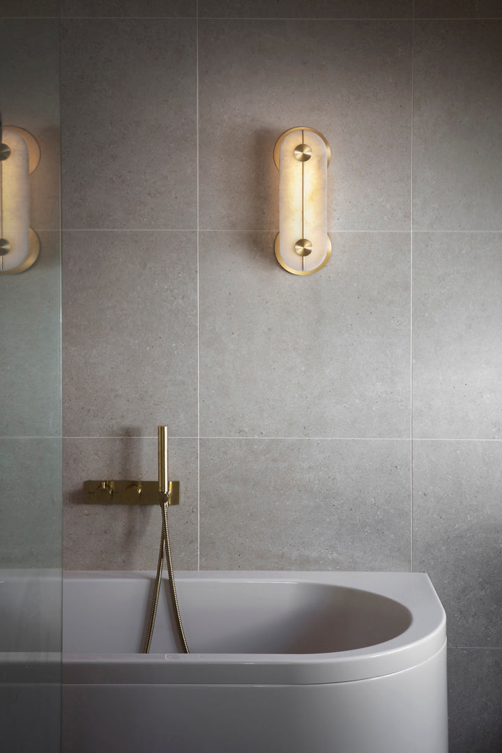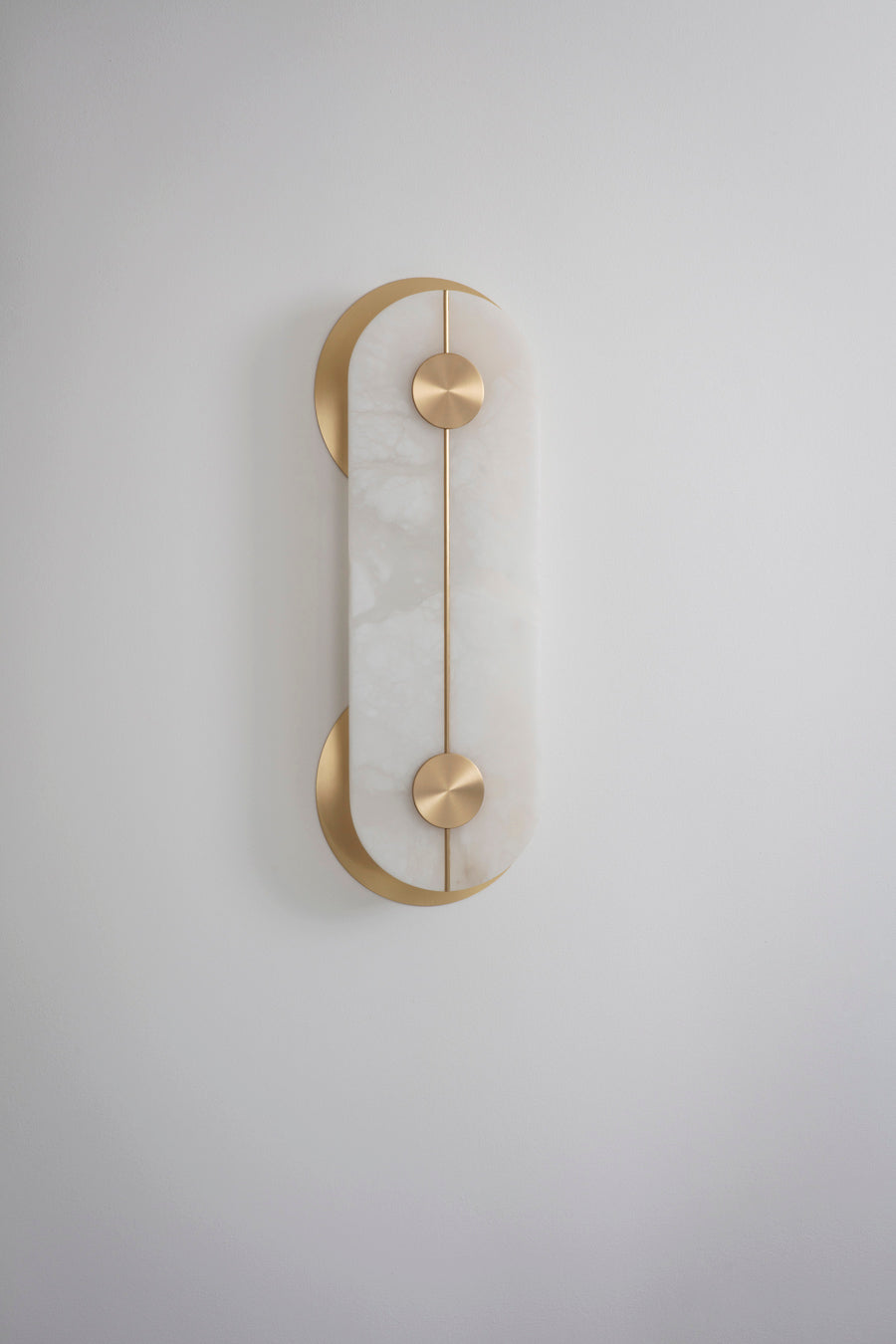 The Brace wall light by Bert Frank features rounded sheet of alabaster, braced by brass bobbins. This elegant wall light is characterised by symmetrical, geometric details. In the initial sketches Brace started off as an African shield, which gradually became honed back to this pure ‘pill’ shape. Designed to cast both a warm wash of light across the wall and illuminate into the room, each piece of alabaster is different so the diffused light has infinite variety. Available in two sizes, the Brace wall light has a IP44 rating and is suitable for wet areas.