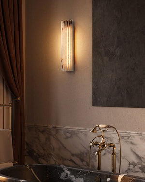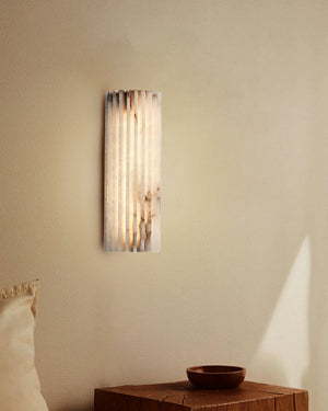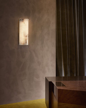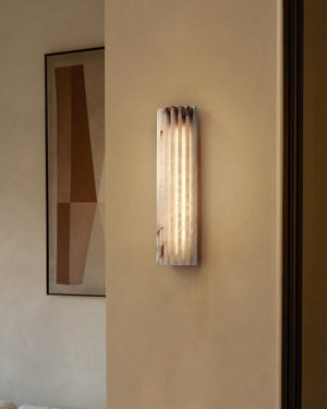 The Hillside Wall Sconce merges Art Deco flair with organic texture. Spanish Alabaster fins radiate soft warmth when lit, paired with a polished aged brass backplate. A timeless statement piece for walls, blending ethereal glow and metallic refinement.