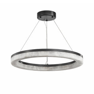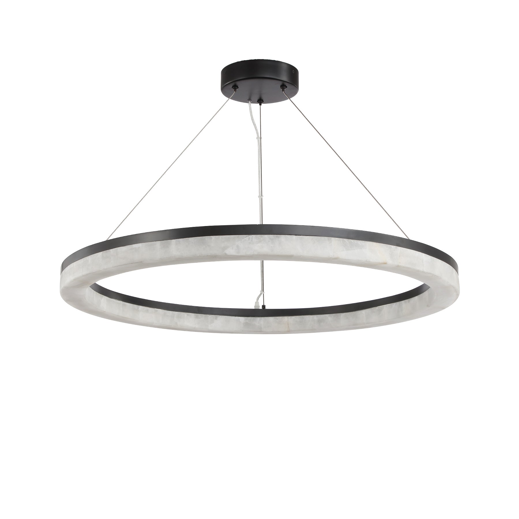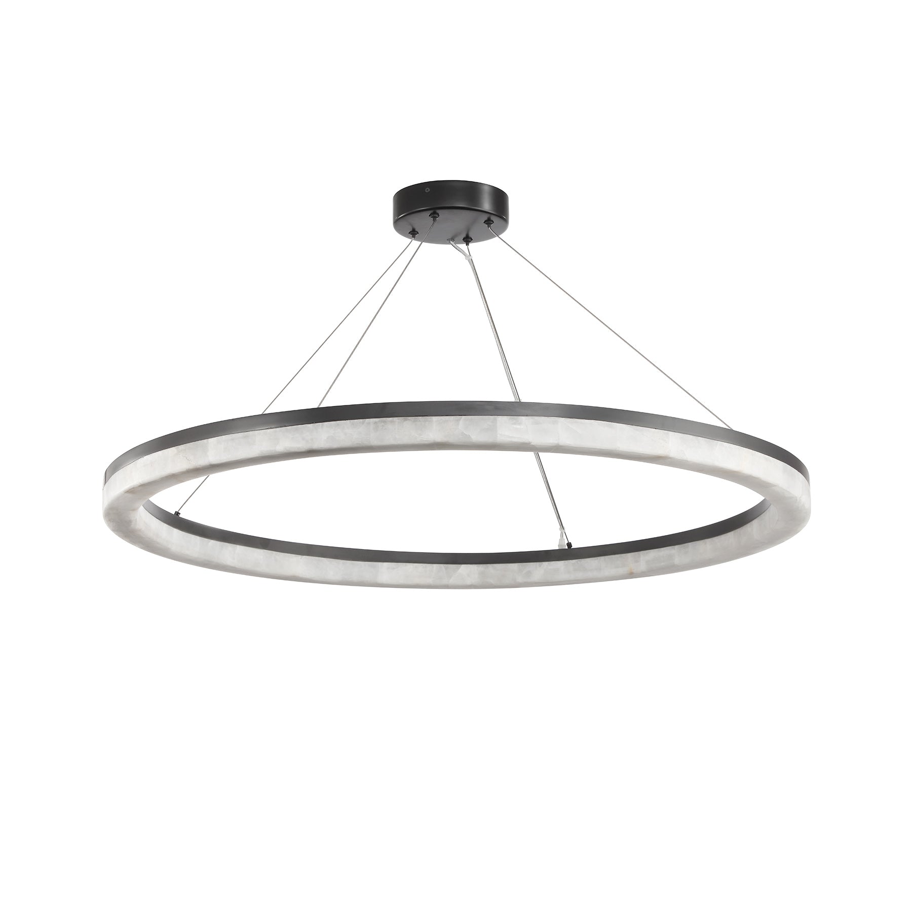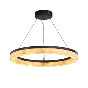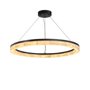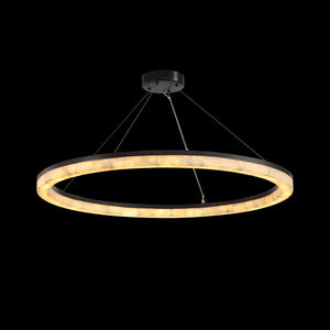 The Calista Chandelier reimagines light as a floating ring of warmth and elegance. Its outer body is sheathed in translucent calcite—each panel unique in its natural veining—gently diffusing illumination through a quiet, creamy glow.