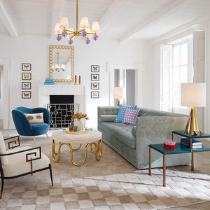 The ultimate jewel for your ceiling six luminous, gem toned crystal balls on warm brass framework, each topped with a brass ball trimmed lined shade. Our Belvedere Six-Light Chandelier is a glamorous go to for glowing up your dining space or a luxe touch in your living room.