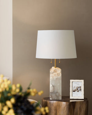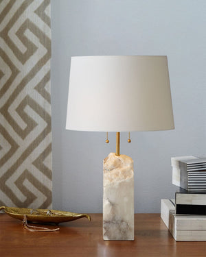 The creative collaboration of alabaster—featuring its raw form—and modern elements creates a contemporary piece with a real edge. Paired with a natural linen tapered shade, this table lamp strikes a stunning balance perfect for any room.