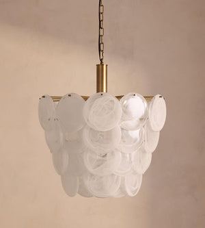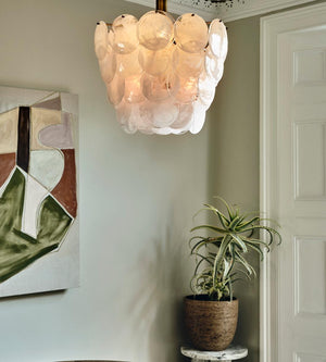 The Elba chandelier is formed into a tiered chevron with clear glass discs that are characterised by white swirls. Hang it in a hallway, bedroom or living room to bring the laid-back elegance of Soho House Rome into your home.