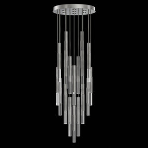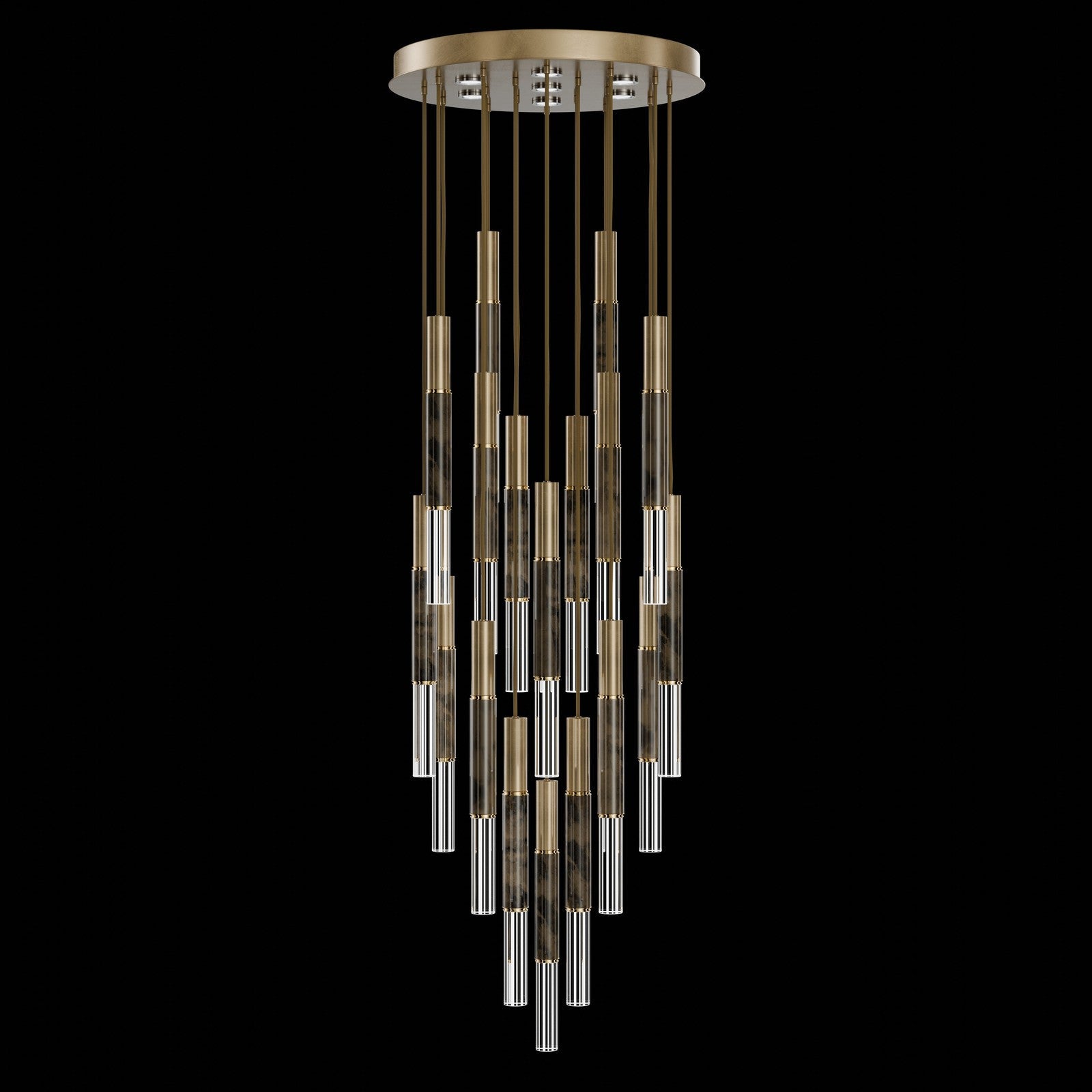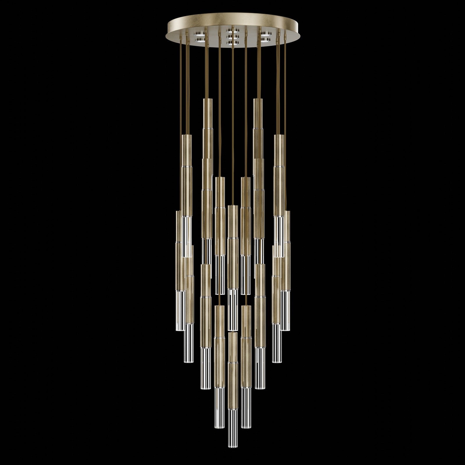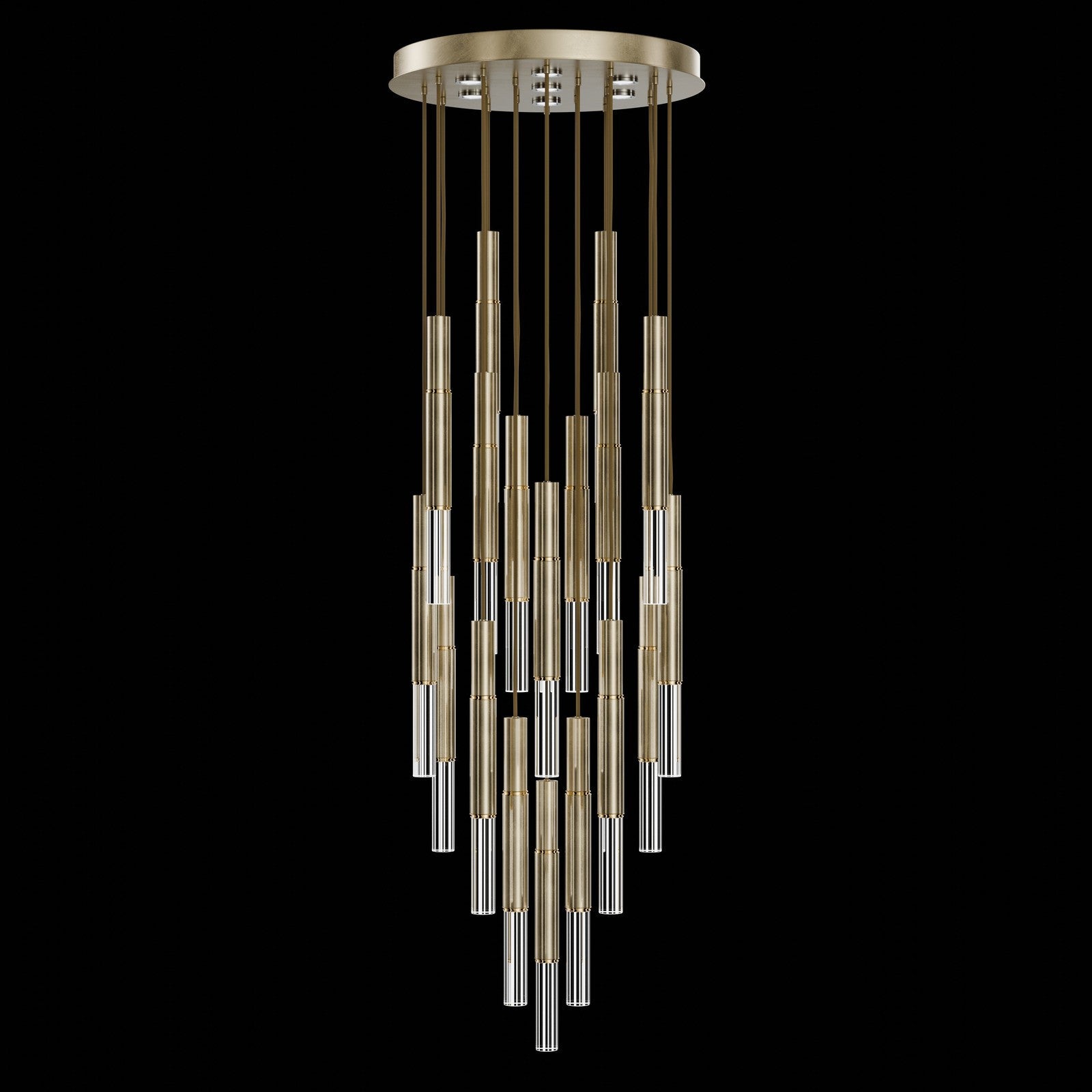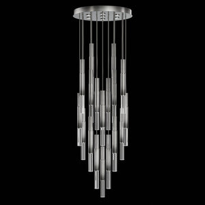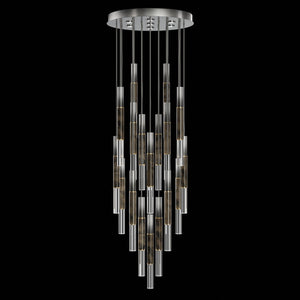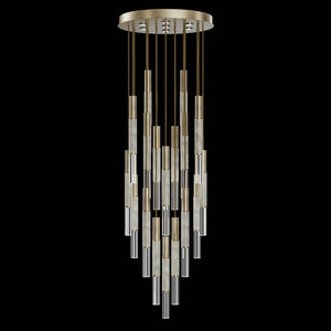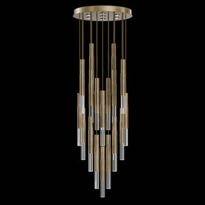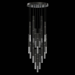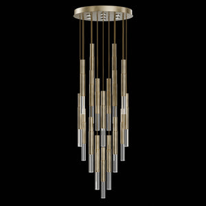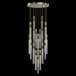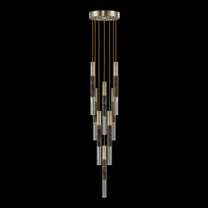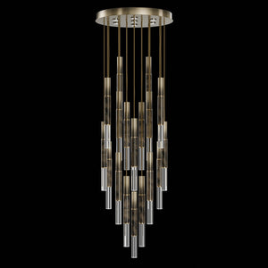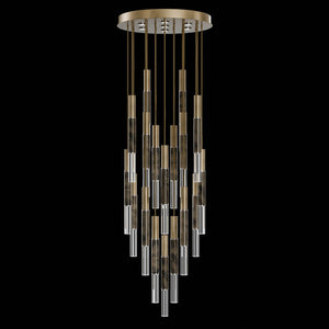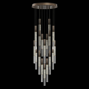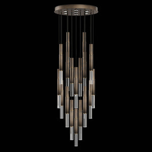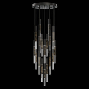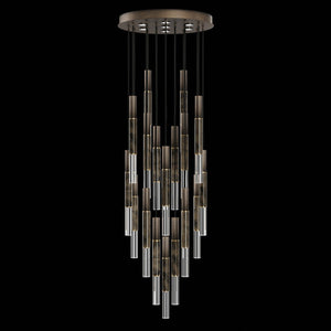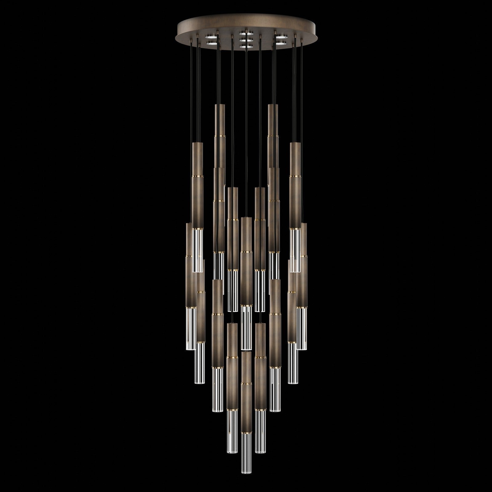 Suspended by adjustable cords, this LED fixture features straight tubular lines and the inclusion of metals carefully handcrafted to transition from parchment to magnificent glass, culminating in a stunning beam of light. Available in a wide range of exquisite finishes, including our five standard finishes and our newest Soft Ombre Bronze & Soft Ombre Silver, with the choice of two inline parchment colors, Charcoal and Smoke, and three special order options: Mink, Burnt Orange & Navy/Gold. Also available with no parchment. Upper & lower lights can be wired independently for single or dual light control.