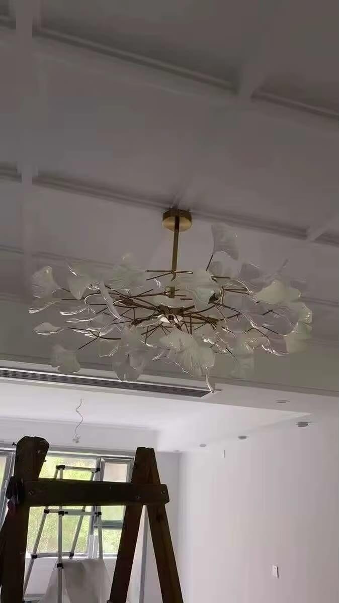 Featuring a classic gold tone with its metal and iron structure, this Ginkgo Leaf Pendant Lamp provides sturdy support and an elegant look. The ginkgo leaves made of ceramic are white and elegant, smooth and easy to clean, and stand in sharp contrast with the golden holder. When the lights are turned on, they emit a soft glow, adding a natural warmth to any room. This fixture is a simple and beautiful lighting option for the modern home.