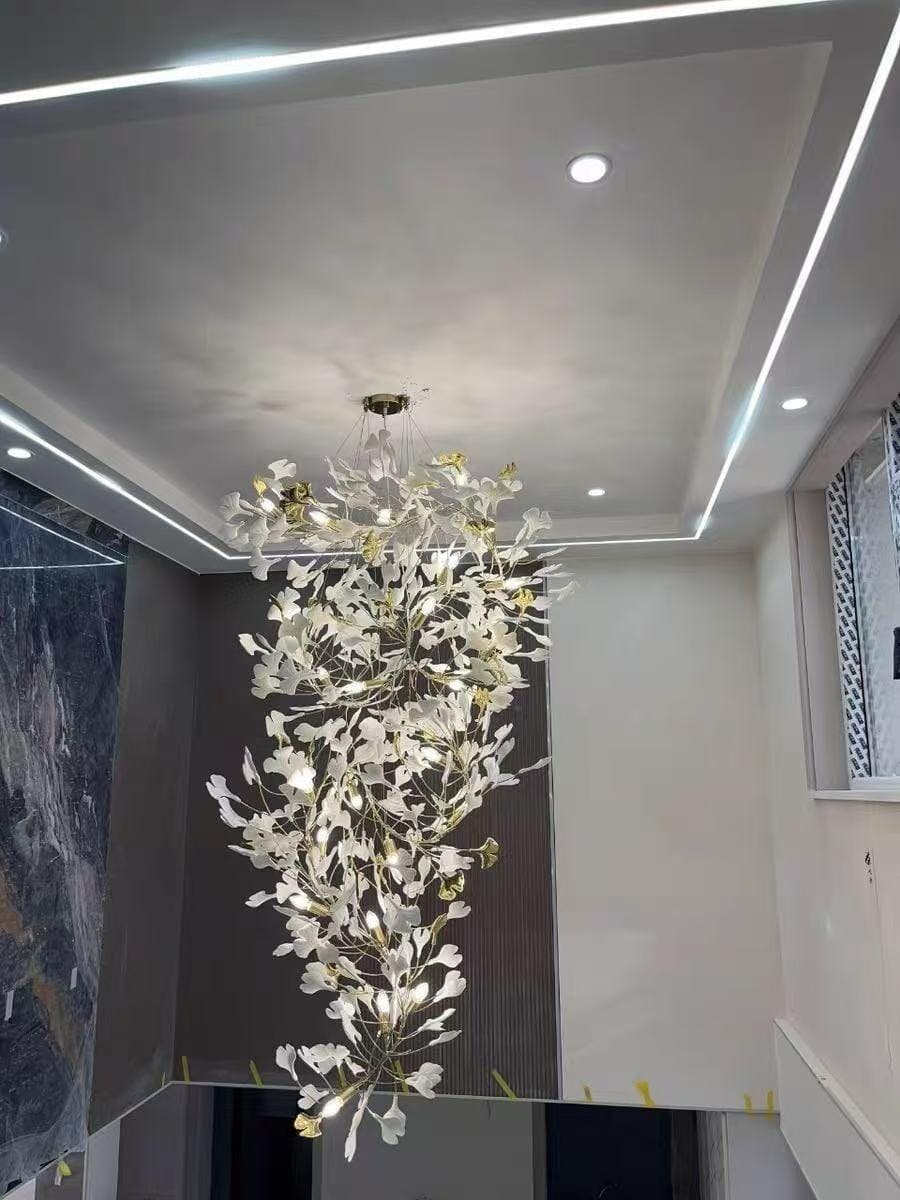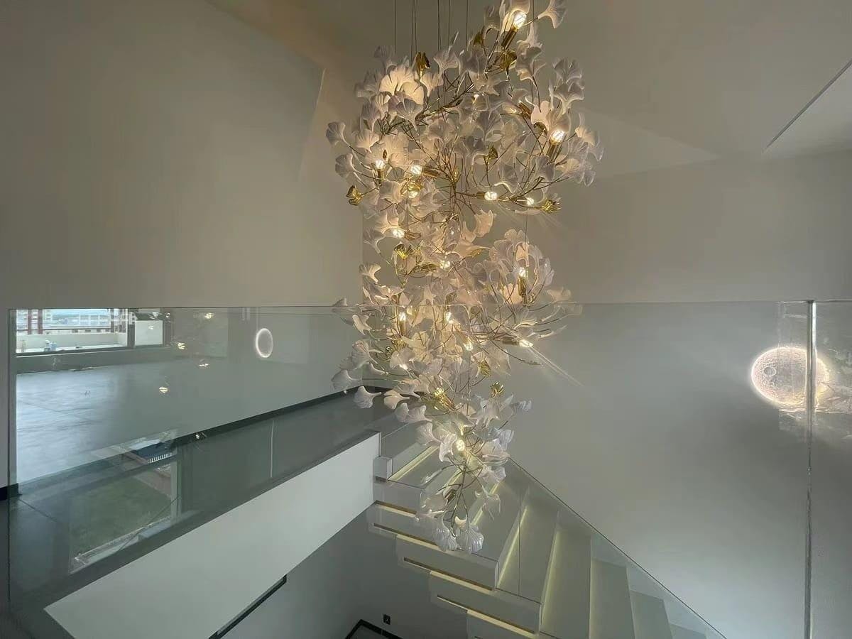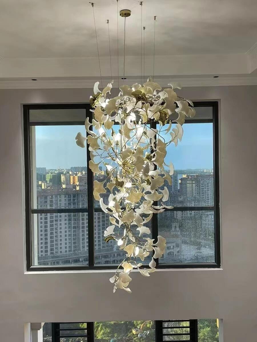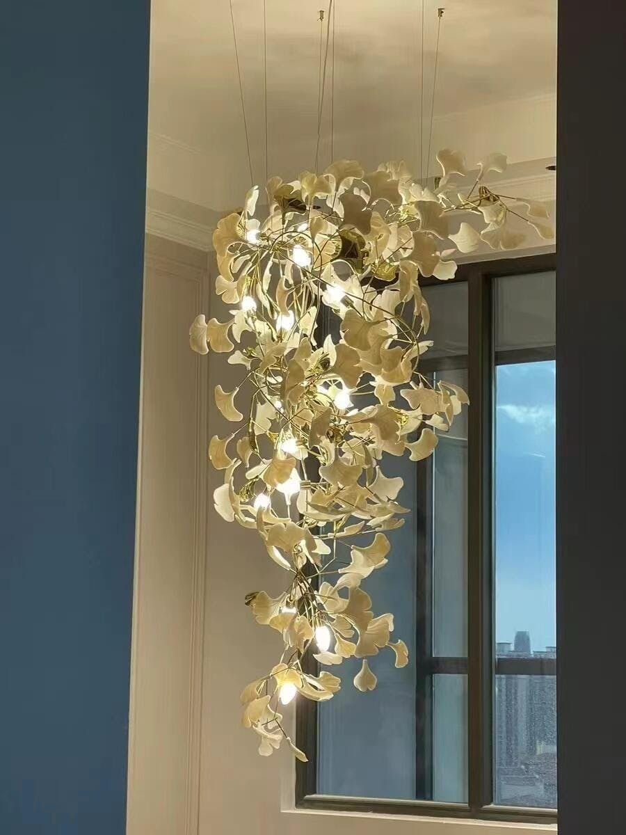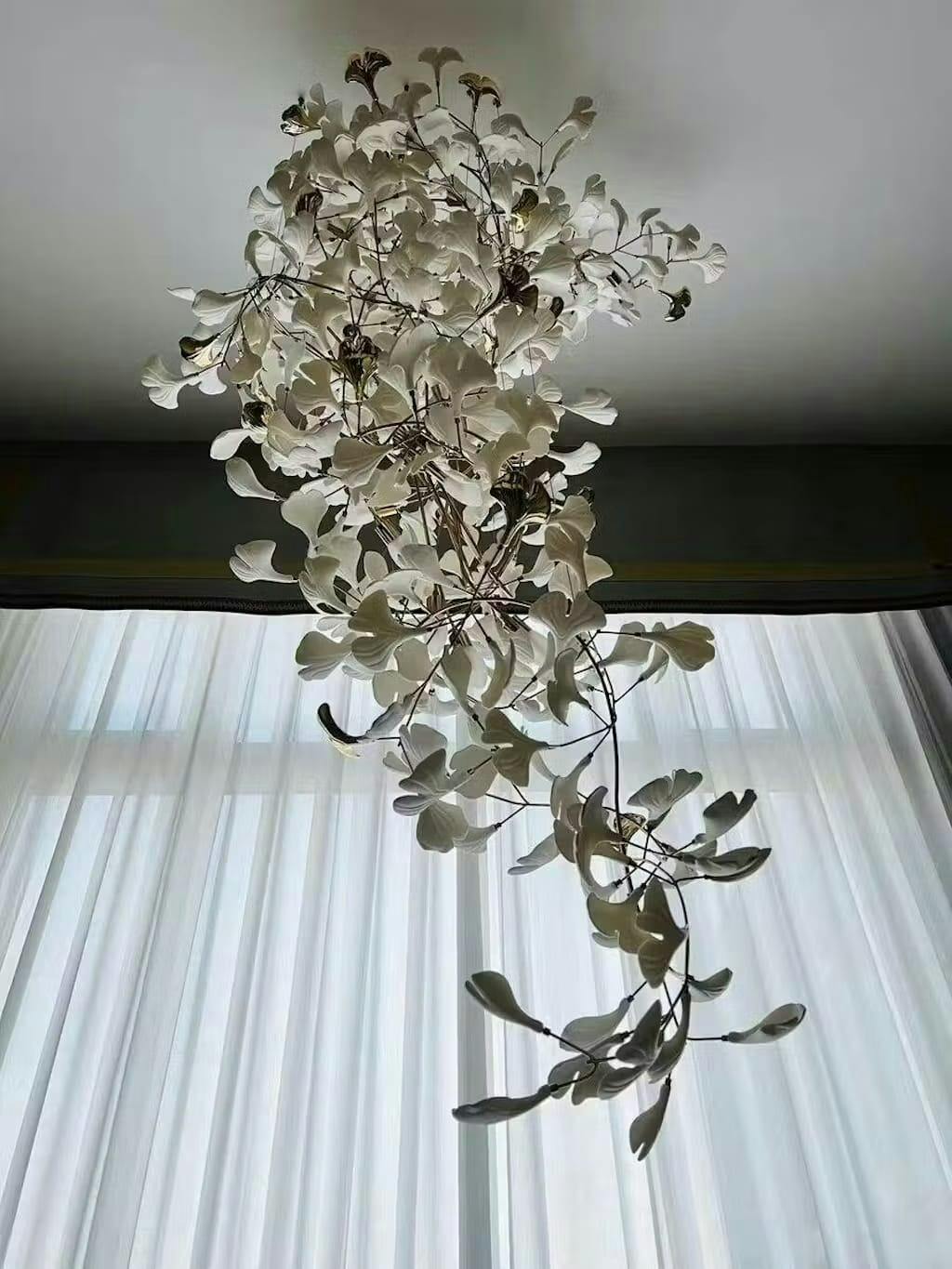 Experience the luxurious style and exquisite design of the Gingko Chandelier Z. Handcrafted porcelain leaves and metal body create a mesmerizing light sculpture, bringing warmth and well-being to any space. With its natural and dynamic energy, it's not just a light but a captivating artwork.