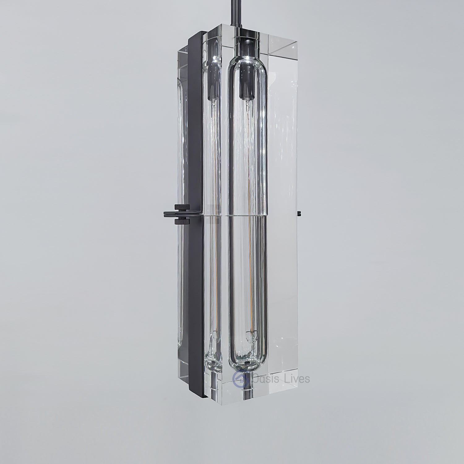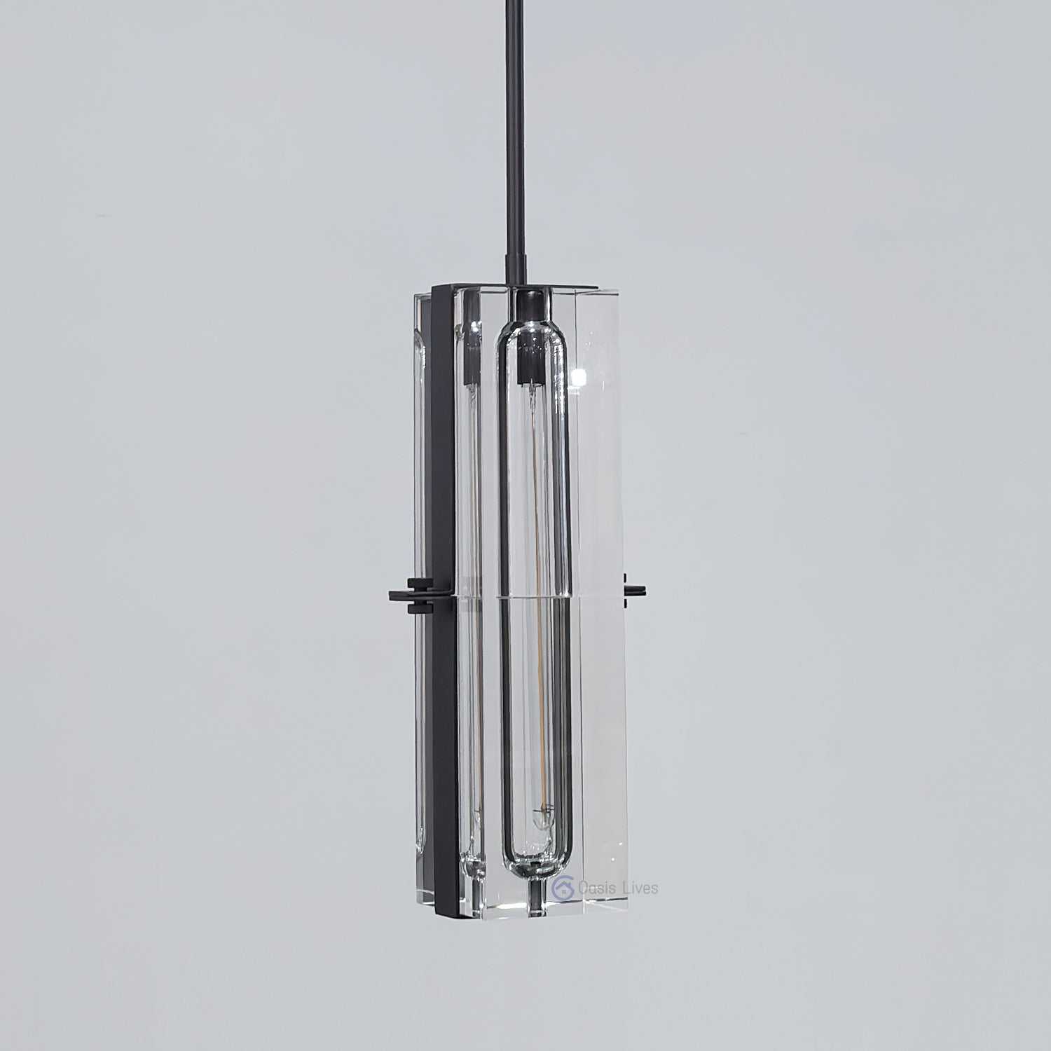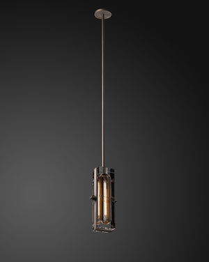 The Glaxy Pendant is machined from solid brass. All parts are hand polished and patina’d. The lead crystal is machined and polished by hand. The brass band secures the crystal to the fixture.