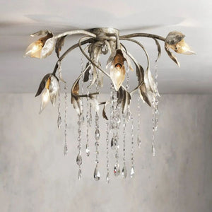 This is collection combines Gothic-style ironwork with Italian glass. The features sliver wrought iron with delicate lines, exuding a unique classical charm. The lampshade is made from exquisite Italian glass, available in colored or clear options, casting a soft and enchanting glow when the light passes through.And creating a mysterious and elegant ambiance, making it perfect for spaces like living rooms or dining areas.