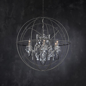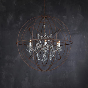 The Gyro Crystal chandelier is inspired by nineteenth century experimental physicist Leon Foucault's gyroscope. In the Gyro Crystal Double, a double layer of aged metal spheres is fixed around a traditional Georgian style chandelier, colliding industrial accents with romance and glamour.