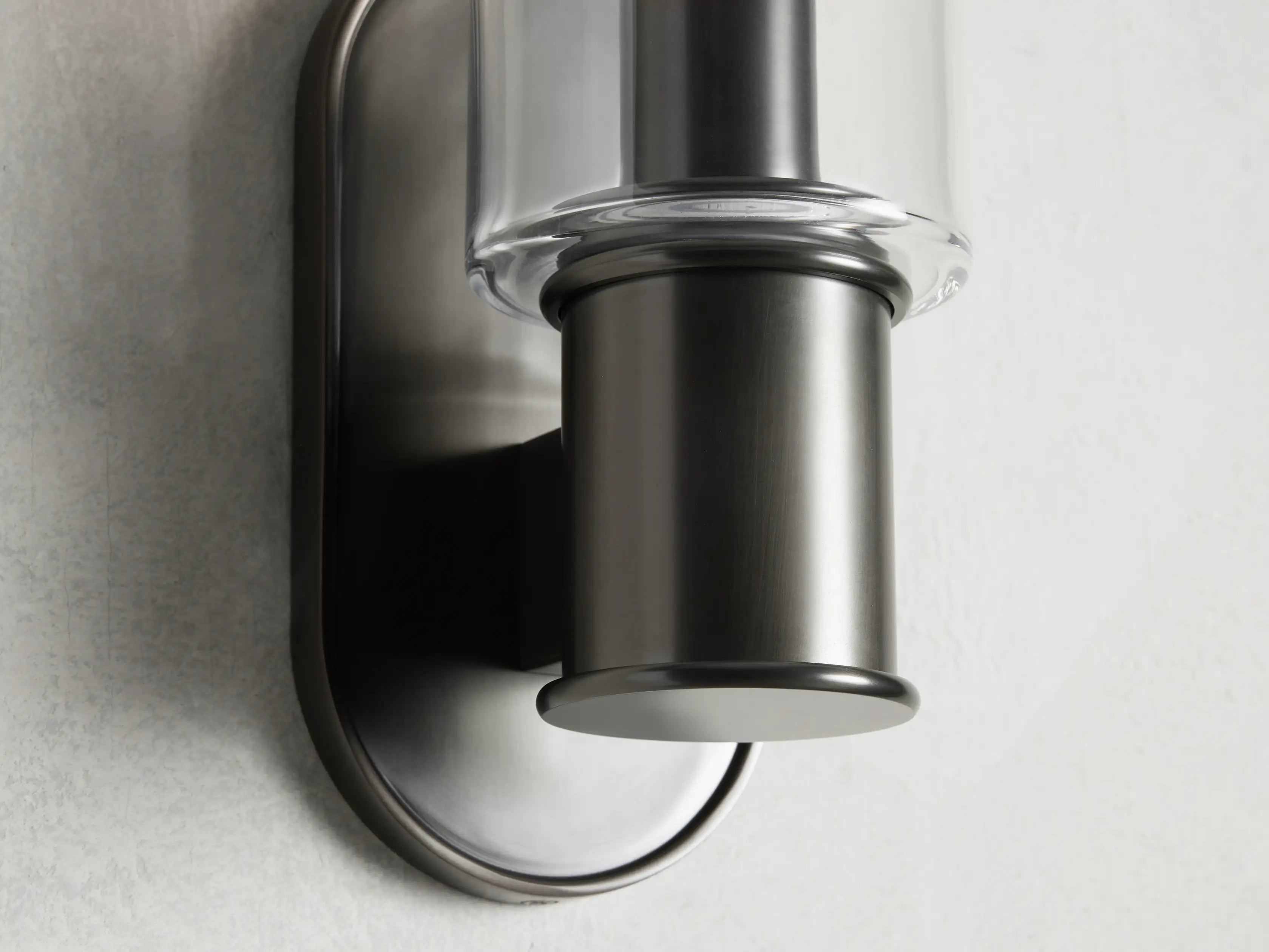 • Harlin is an Arhaus exclusive lighting collection crafted from steel and brass with a polished nickel, bronze plated, or burnished brass finish with a clear glass cloche to complement your bathroom aesthetic.