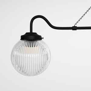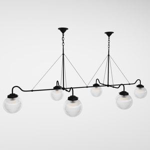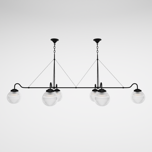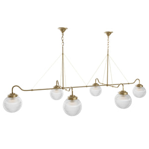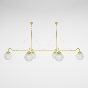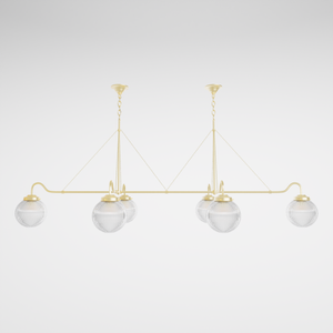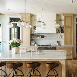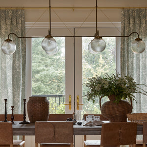 Inspired by the country side, the Hayden collection is built with solid brass that's hand finished. Each Hayden fixture arm features a thick ribbed glass globe secured by a house bent shepherd crook.  We love this fixture in high ceiling rooms, above wide kitchen islands, over larger dining tables, and in game rooms.