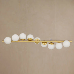 Our Kenney Linear Chandelier showcases softly glowing globes that punctuate a brushed brass armature in a fluid arrangement, turning ambient light into a dynamic, elevated moment.