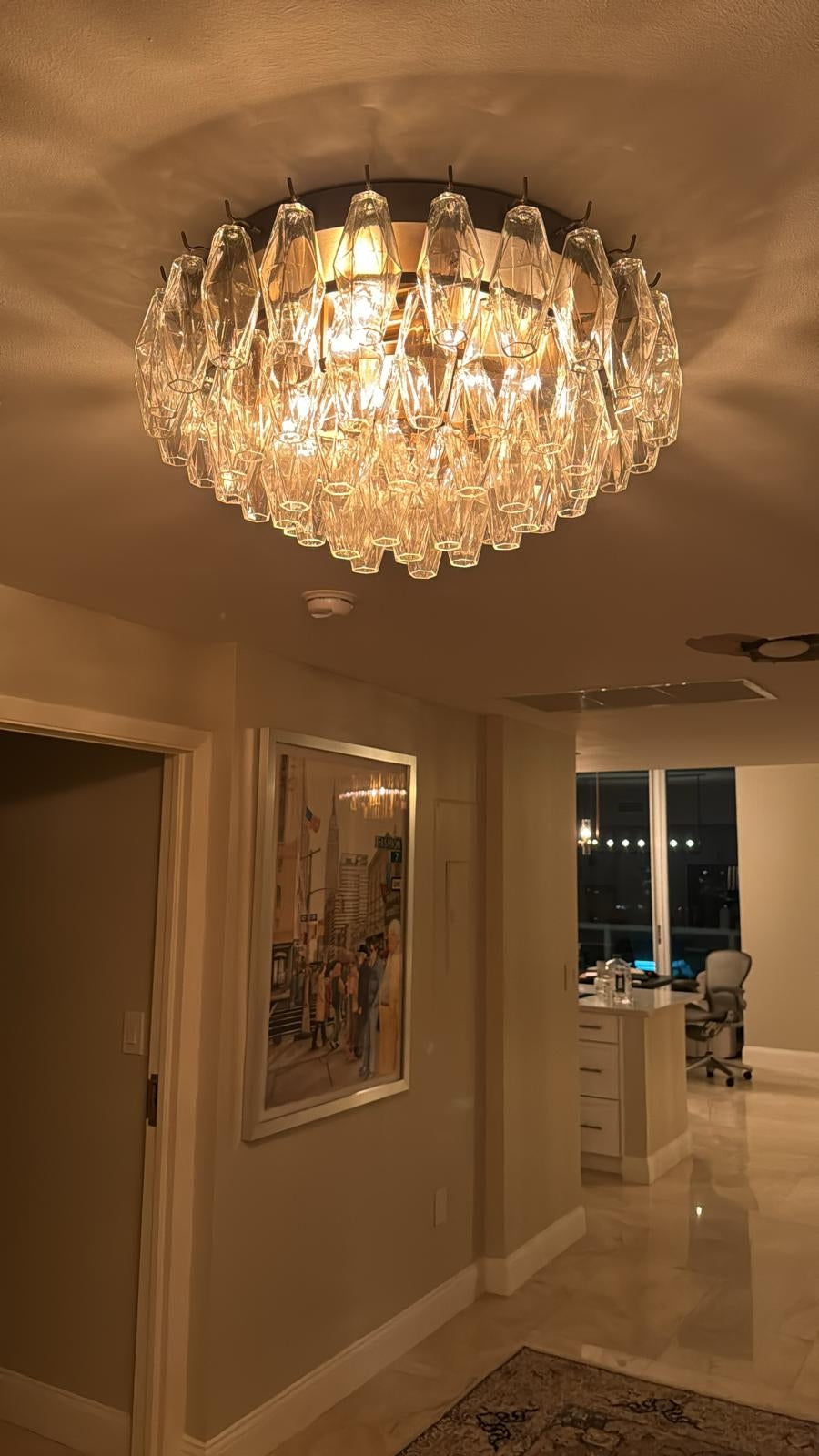 Our fixtures feature cascading glass prisms that refract light into mesmerizing patterns—combining minimalist steel frames with faceted beauty.