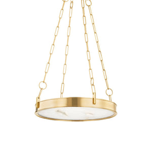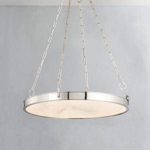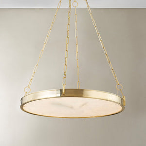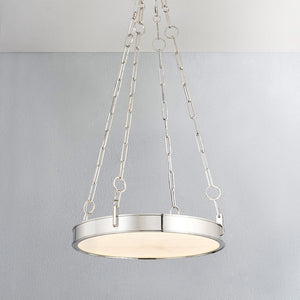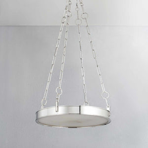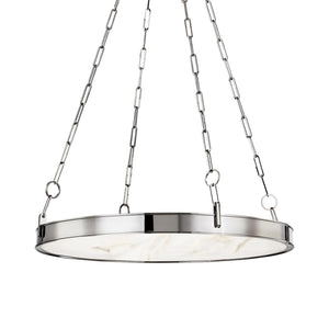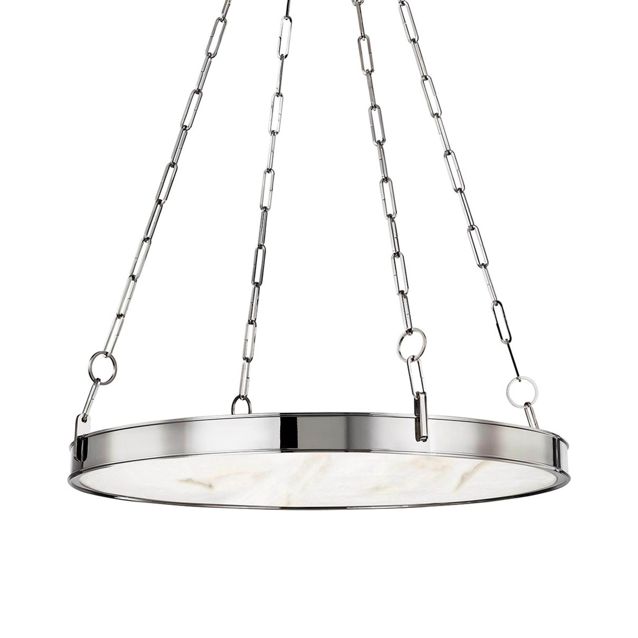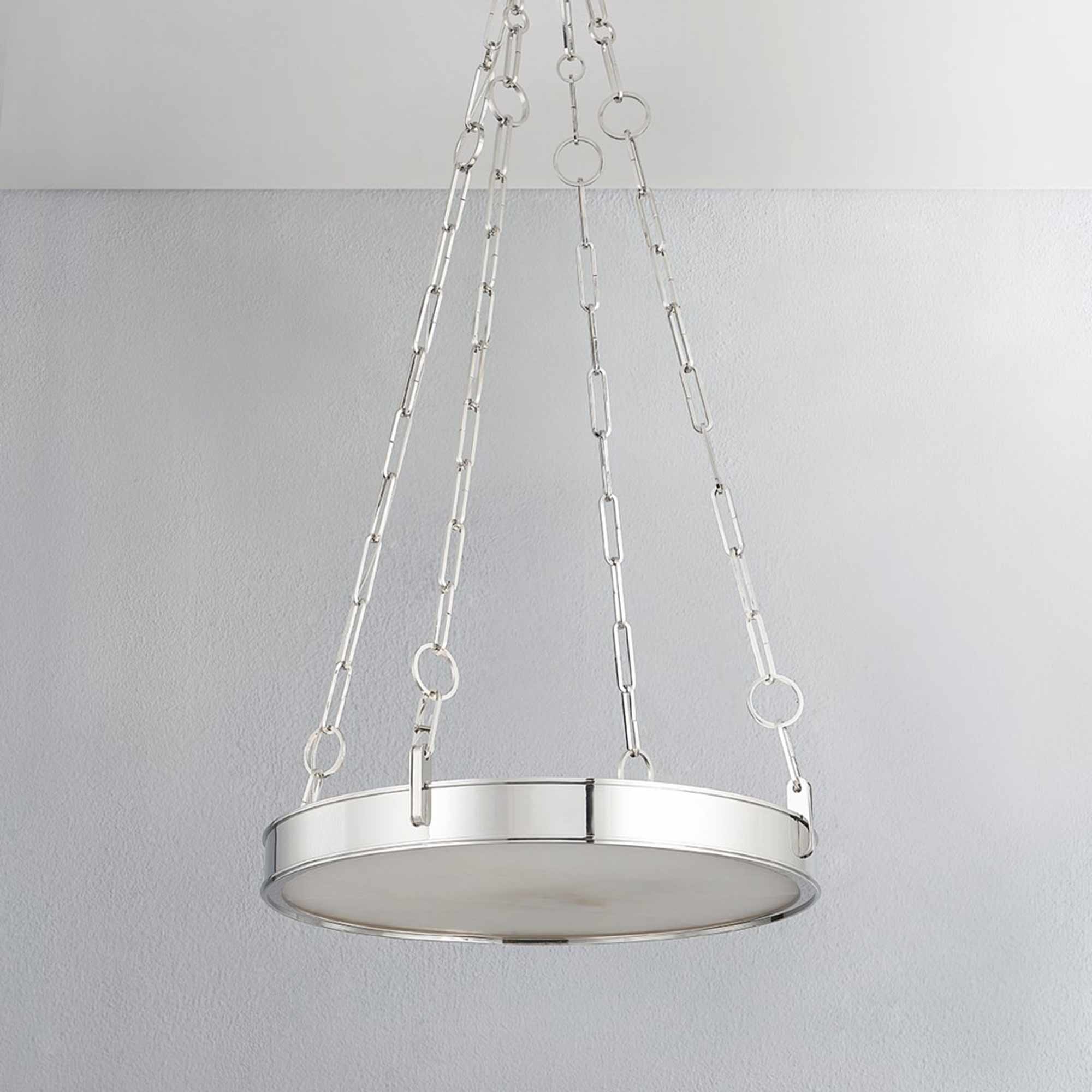 Explore a blend of old and new in lighting with the Kirby LED Chandelier from Hudson Valley Lighting. Simple design elements make good use of gleaming metal framing with bold cable chain suspension. Chic white Spanish alabaster forms a diffuser that softens output of energy-efficient integrated LED lighting.