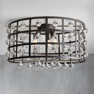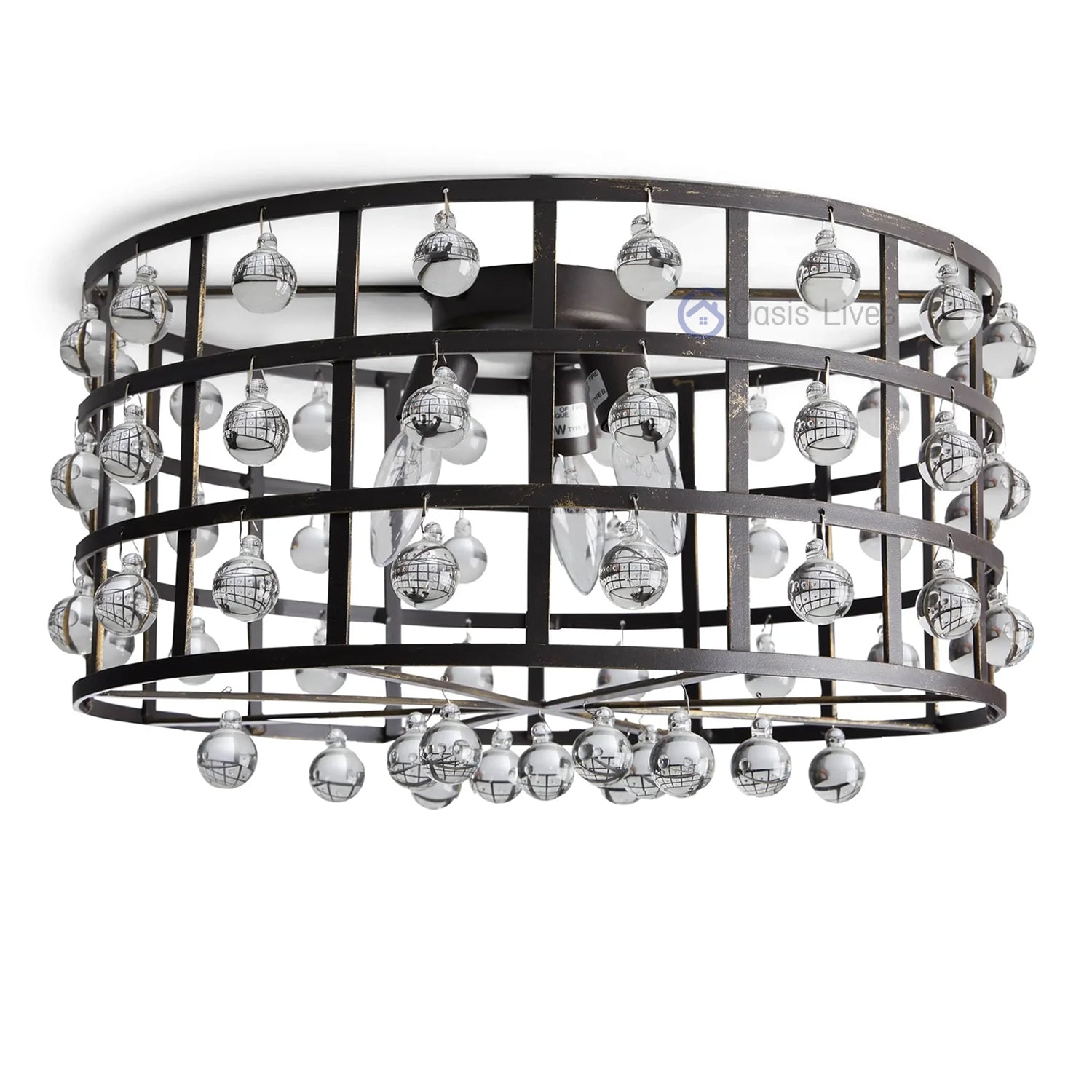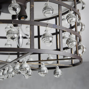 Industrial chic meets modern flair in this eye-catching flush-mount light. Crafted in Italy, this fixture’s iron cage frame with antiqued patina is inspired by vintage factory lighting. Glass crystal spheres add unexpected glamour.