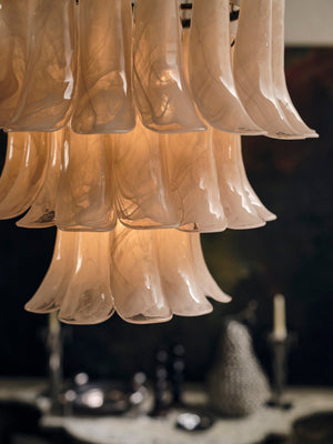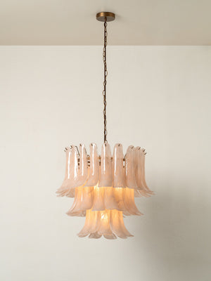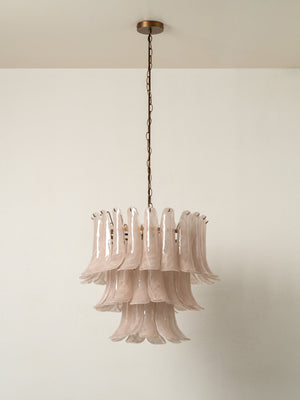 Lonso is a mid century-inspired chandelier guaranteed to add vintage glamour to a bedroom or dining room. Three tiers of flared, hand-blown glass leaves rich in marbled accents hang from a frame in our signature aged brass. As opulent as jewellery, this statement piece is fitted with an adjustable chain in matching brass and a chocolate-brown, textured yarn cable.