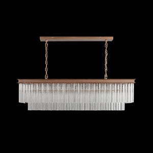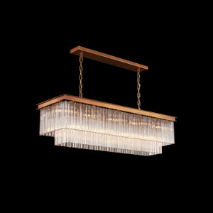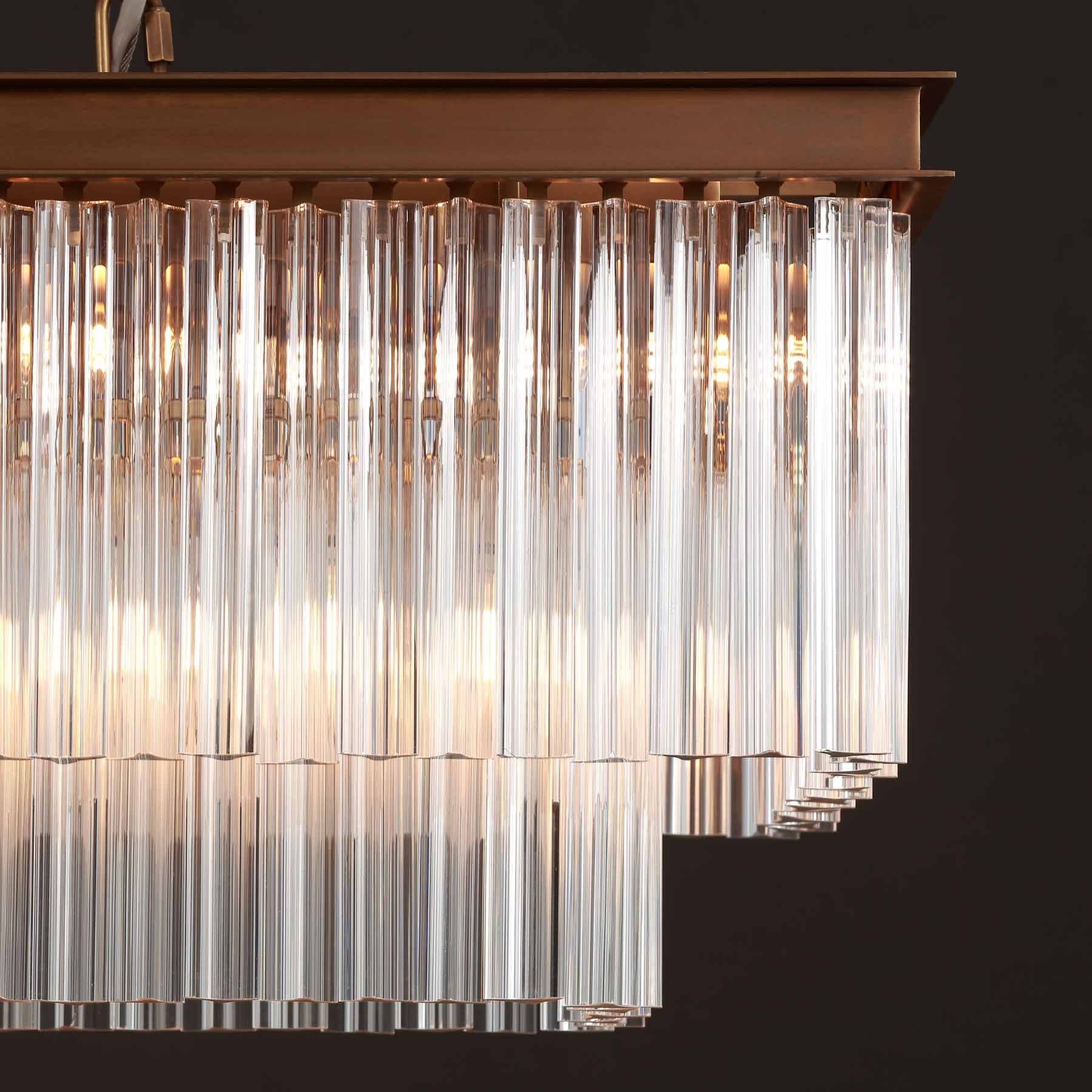 A study in line, structure, and poise. The Marais Rectangular Chandelier extends the series’ tiered glass-rod language across a linear plan. Vertically aligned rods step in long, measured terraces, composing a luminous proscenium—precise at the edges, fluid through the center. Suspended beneath a warm satin-brass rail with fine cabling, the silhouette seems to float, balancing architectural discipline with an inviting glow.