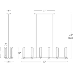 The Marjorie Linear Chandelier is machined from solid brass. All parts are polished and patina'd. The shades are handmade of white frosted soda-lime glass.