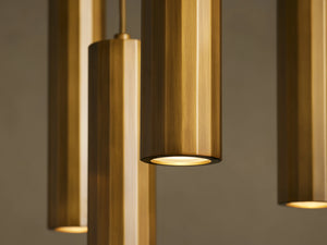 Our Matthe Collection features elongated, ribbed metal shades that descend from tonal adjustable cords; the textured surfaces catch the light with striking dimensionality to perfectly accent any space.