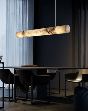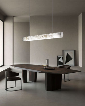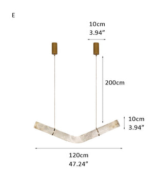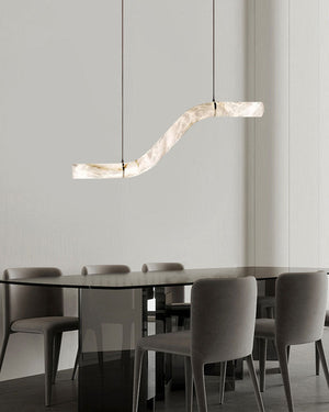 An exploration of balance and expressive sculpture, this series alabaster chandeliers focus in any environment. Consisting of a closed loop structure, the sinuous form nods to the mathematical symbol for infinity and the never-ending flow of light through time and space.
