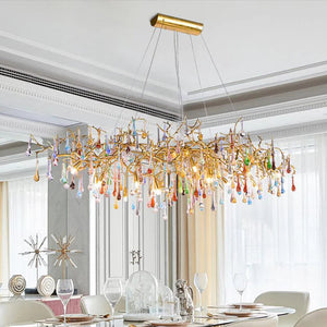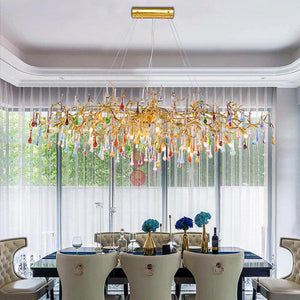 Modern Linear Colorful Crystal Branch Chandelier is made of handmade brass and colorful glass drops. The glasses are mixed with different colors, gives an appealing and attractive appearance, makes it a statement for your dining area over your dining table.