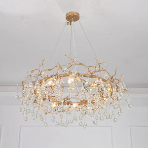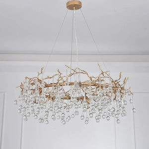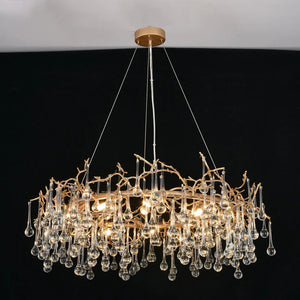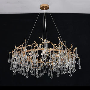 The  water drop chandelier is made of brass and glass drops, This artistic lighting fixture features a center area where life-like branches start to twist and turn from, covered with a luxurious brass finish. Multiple light bulbs provide the dramatics of light rays glistening through the crystal droplets.