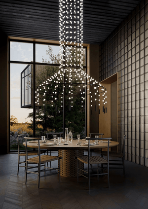 Multidot redefines the traditional chandelier with a contemporary design featuring metal rings that enhance its structural versatility. Suspended from the ceiling, these rings support and shape the light cables, enabling fluid, dynamic forms that evolve visually. Attaching the rings directly to the cables and light spheres creates tension, resulting in sharper, more precise geometries. This combination of elements allows Multidot to blend artistic expression with architectural presence, making it a sophisticated lighting solution for modern interiors.
