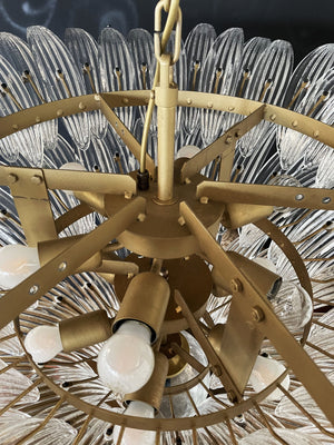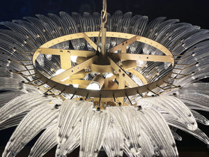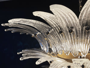 This masterpiece of an Italian chandelier is adorned with 104 Clear Palmette glass pieces. With its 104 hand-blown Murano glass elements, this chandelier is sure to be a focal point in any room it graces. The chandelier is also known under the model name "Palmette" and is a classic and well-recognized Murano lamp. The frame comes standard in matte gold (as shown in the pictures) but is also available in shiny gold, silver-patinated chrome, and shiny chrome.