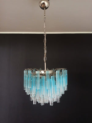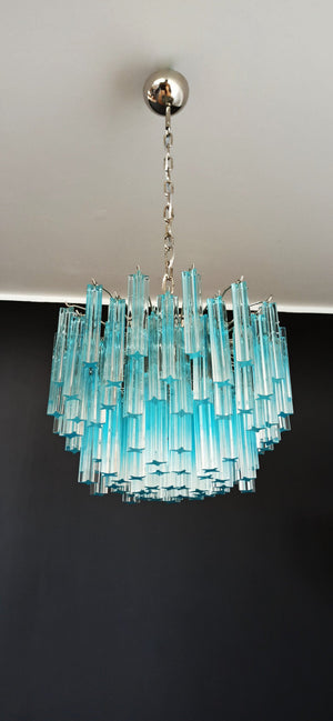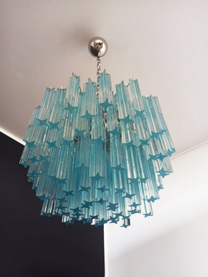 This masterpiece of an Italian chandelier is adorned with 107 Blue Prism glass pieces of the quadriedri type. With its 107 hand-blown Murano glass elements, this chandelier is sure to be a stunning focal point in any room it graces. The frame is available in silver patinated chrome, matte gold, shiny gold, and shiny chrome.