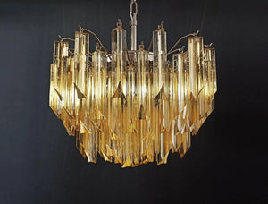 Handcrafted in Murano, Italy, this stunning chandelier is adorned with 107 prisms, each delicately hand-cut to reflect and refract light, creating a warm, inviting atmosphere. The vibrant yellow color adds a pop of color to any space. Elevate your home with this exquisite, unique piece.