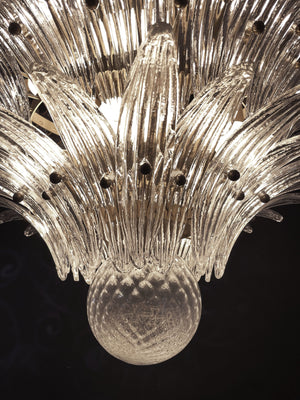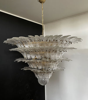 This masterpiece of an Italian chandelier is adorned with 163 Clear Palmette glasses. With its 163 hand-blown Murano glass elements, this chandelier will undoubtedly be a focal point in any room it graces. The chandelier is also known by the model name "Palmette" and is a classic and renowned Murano Lamp. The frame comes standard in matte gold (as shown in the pictures), but it is also available in shiny gold, silver patinated chrome, and shiny chrome.