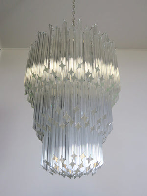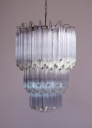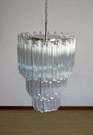 This masterpiece of an Italian chandelier is adorned with 184 clear Prism glass pieces of the quadriedri type. With its 184 hand-blown Murano glass elements, this Murano chandelier will undoubtedly be a focal point in any room where it is placed. The frame is available in silver patinated chrome, matte gold, shiny gold, and shiny chrome.