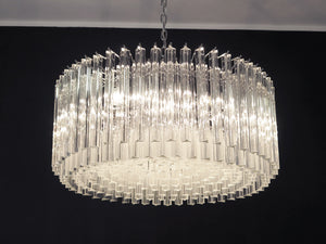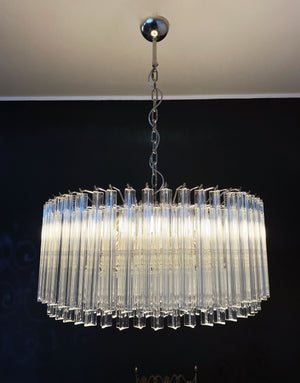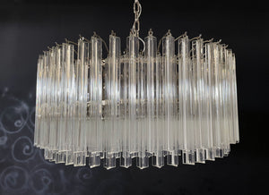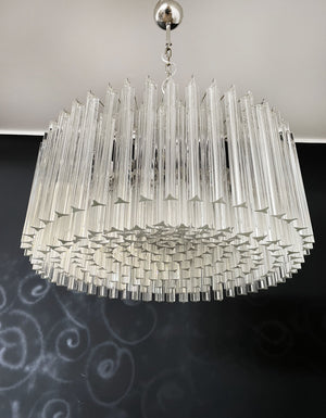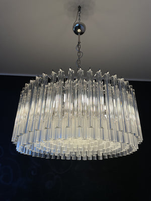 This masterpiece of an Italian chandelier is adorned with 265 Clear Prism glass pieces of the triedri type. With its 265 hand-blown Murano glass elements, this chandelier will undoubtedly be a focal point in any room it graces. The frame is available in silver patinated chrome, matte gold, shiny gold, and shiny chrome.