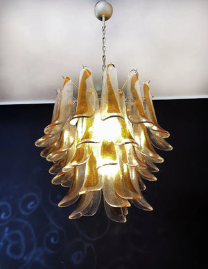 This masterpiece of an Italian chandelier is adorned with 41 Yellow Petal glass pieces. With its 41 hand-blown Murano glass elements, this chandelier is sure to be a stunning centerpiece in any room it graces. The frame comes standard in silver patinated chrome (as seen in the pictures), but it is also available in matte gold, shiny gold, and shiny chrome.