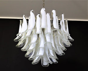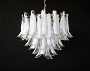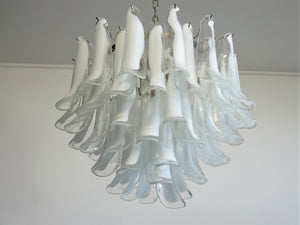 This masterpiece of an Italian chandelier is adorned with 53 Clear Petal glass pieces. With its 53 hand-blown Murano glass elements, this chandelier is sure to be a stunning focal point in any room it graces. The frame comes standard in silver patinated chrome (as shown in the images), but it is also available in matte gold, shiny gold, and shiny chrome.