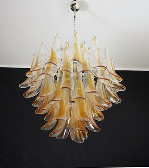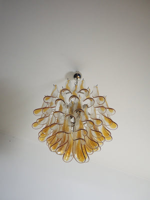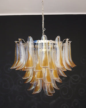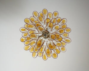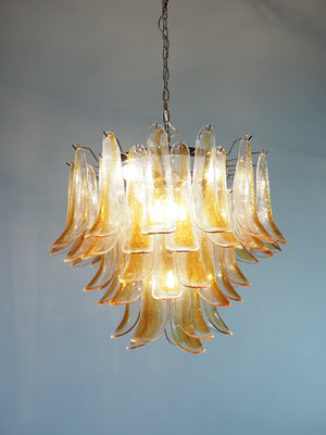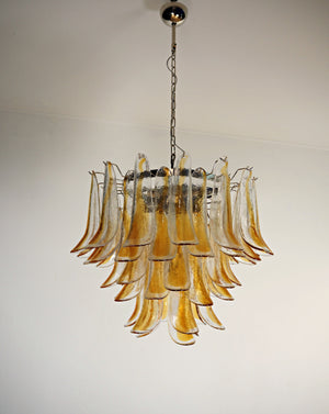 This masterpiece of an Italian chandelier is adorned with 53 Yellow Petal glass elements. With its 53 handcrafted Murano glass pieces, this chandelier is sure to be a stunning focal point in any room it adorns. The frame comes standard in a silver patinated chrome finish (as seen in the pictures), but is also available in matte gold, shiny gold, and polished chrome.